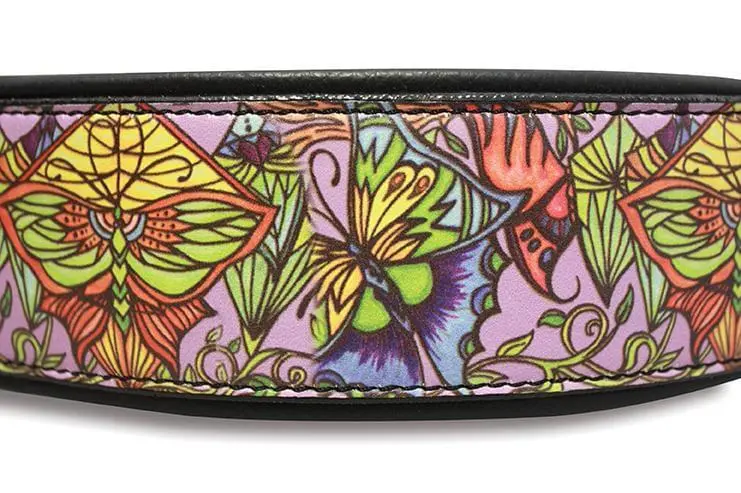 An Industry- first image transfer technology allows the artwork to be precisely mirrored onto the leather. The vivid colors and design are flawlessly captured from the original sketch. Made from 100% Genuine top grain Argentinean leather and soft padded leather bottom. Stainless steel hardware and a genuine brass buckle are used for the utmost in strength and durability. A generous layer of Resolene is applied to each collar before it is sold. Resolene is a clear sealant that protects the outer layer from the elements and prevents any fading.