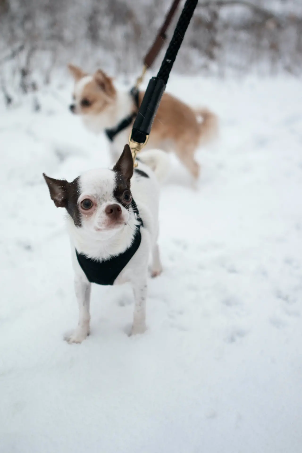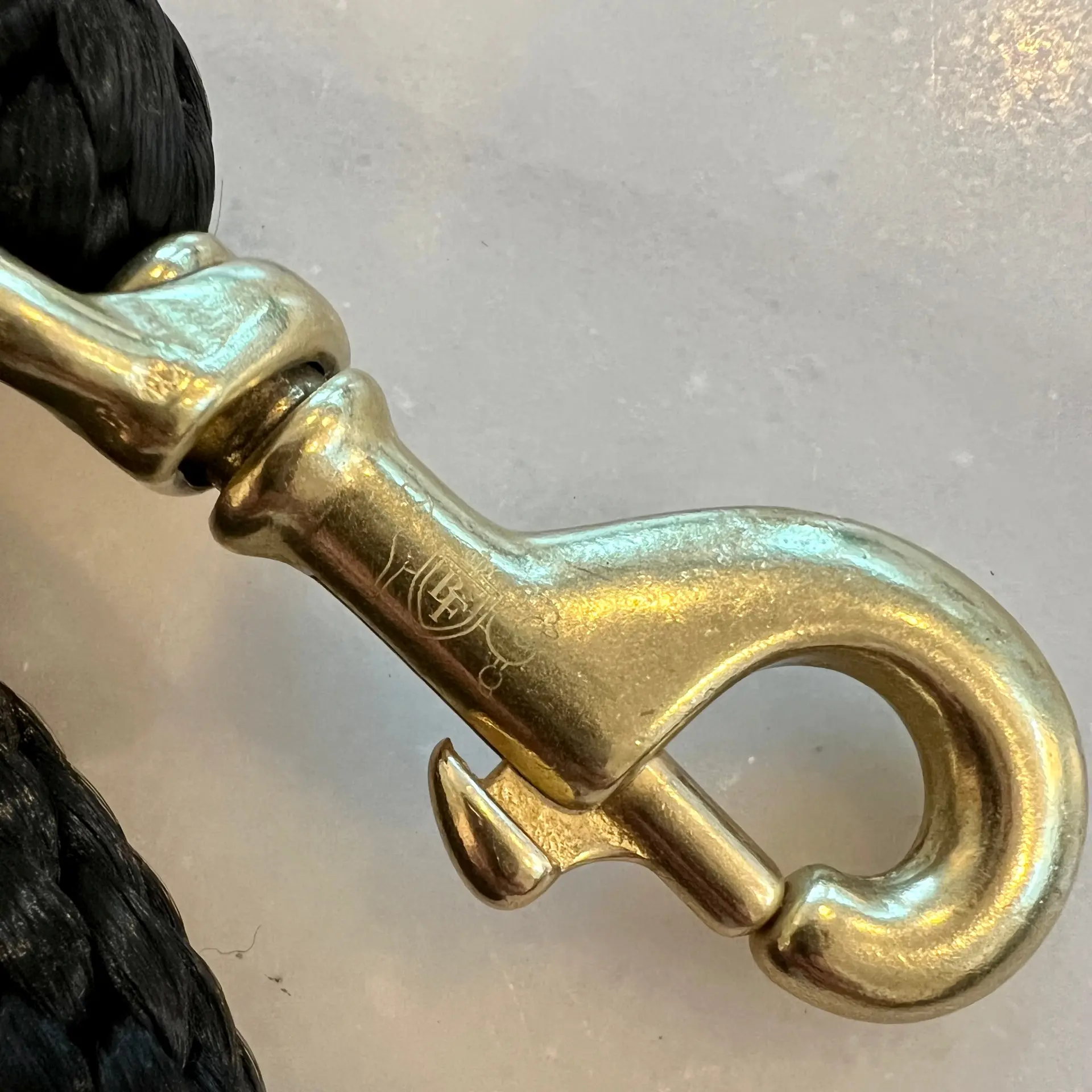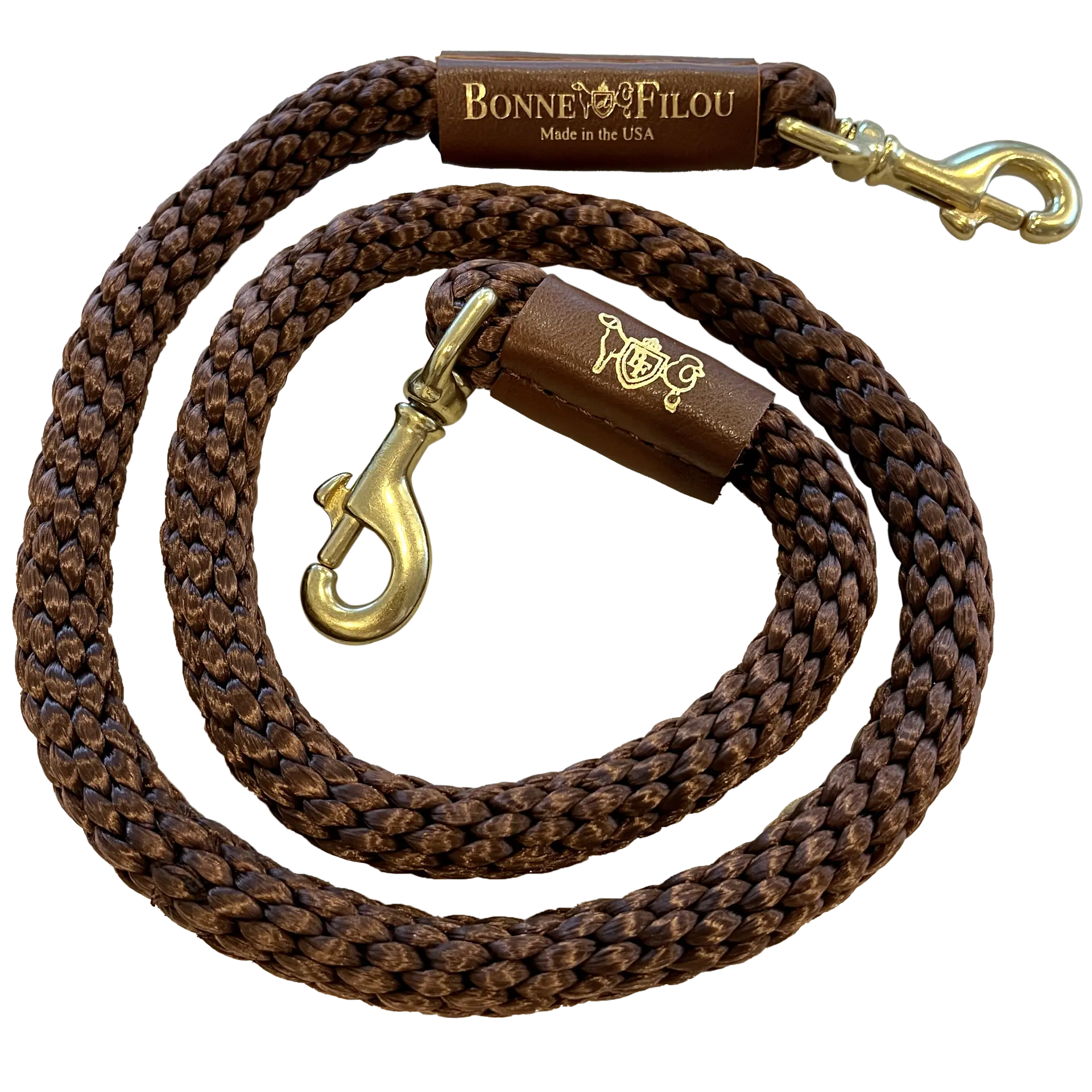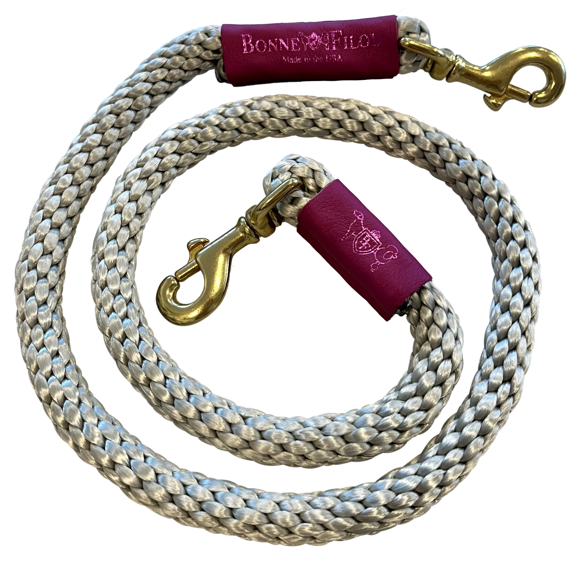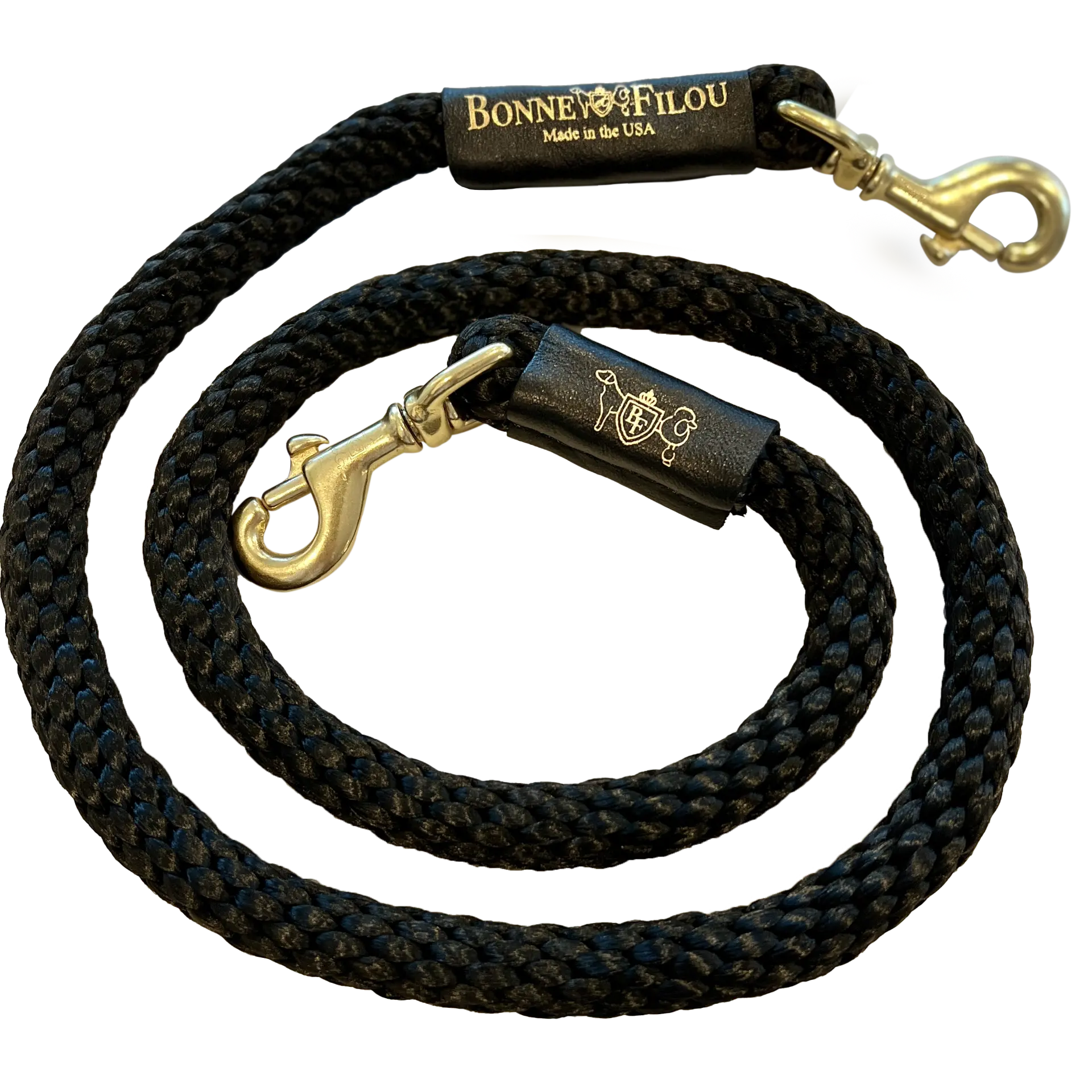 This leash is 4’in length(when paired to our shearling fur grip, it isa 5 full leash), with2 genuine leather foiled Bonne et Filou sleeves and 2 durable solid brass swivel snaps (with Bonne Et Filou logo lasered in).